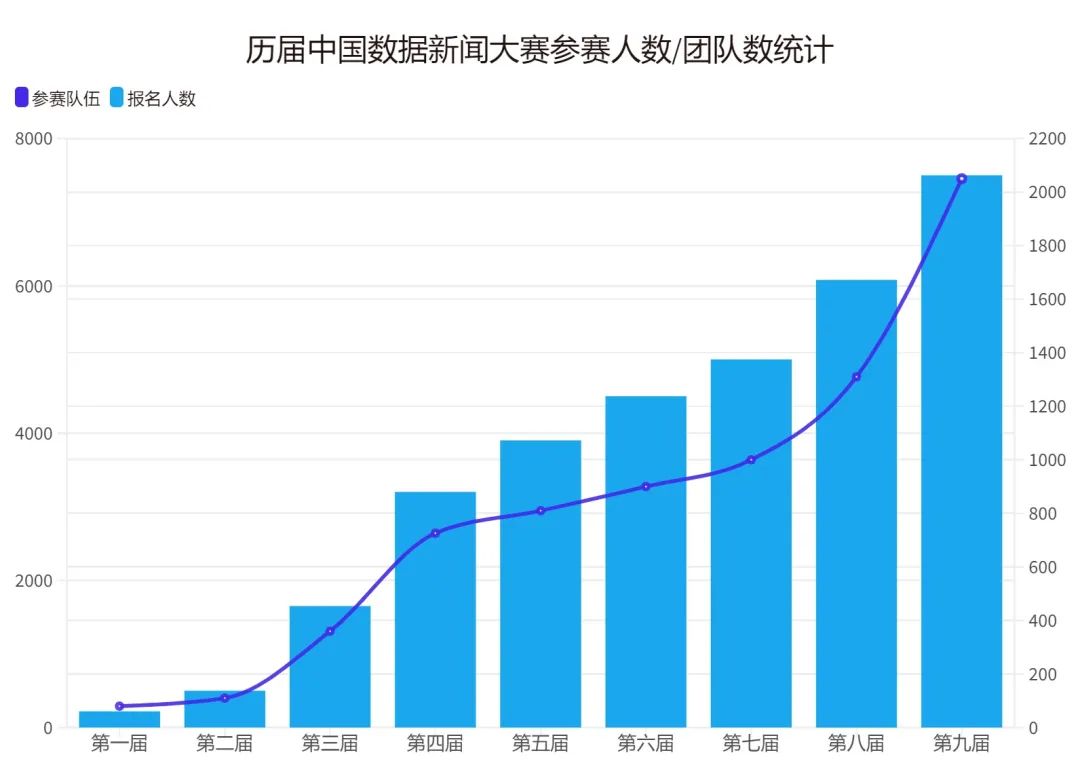 8月23日,由我院联合全国二十余所新闻传播院系举 办的第九届中国数据新闻大赛报名结束。据组委会统计:本届大赛共吸引了来自380余所高校、20余家媒体机构的2000余支队伍、7500余人报名。本届大赛的参赛学校数量、参赛队伍数量、参赛人员数量创历史新高,参赛选手跨专业、跨领域合作特点突出,赛事的全国覆盖面更加广泛。