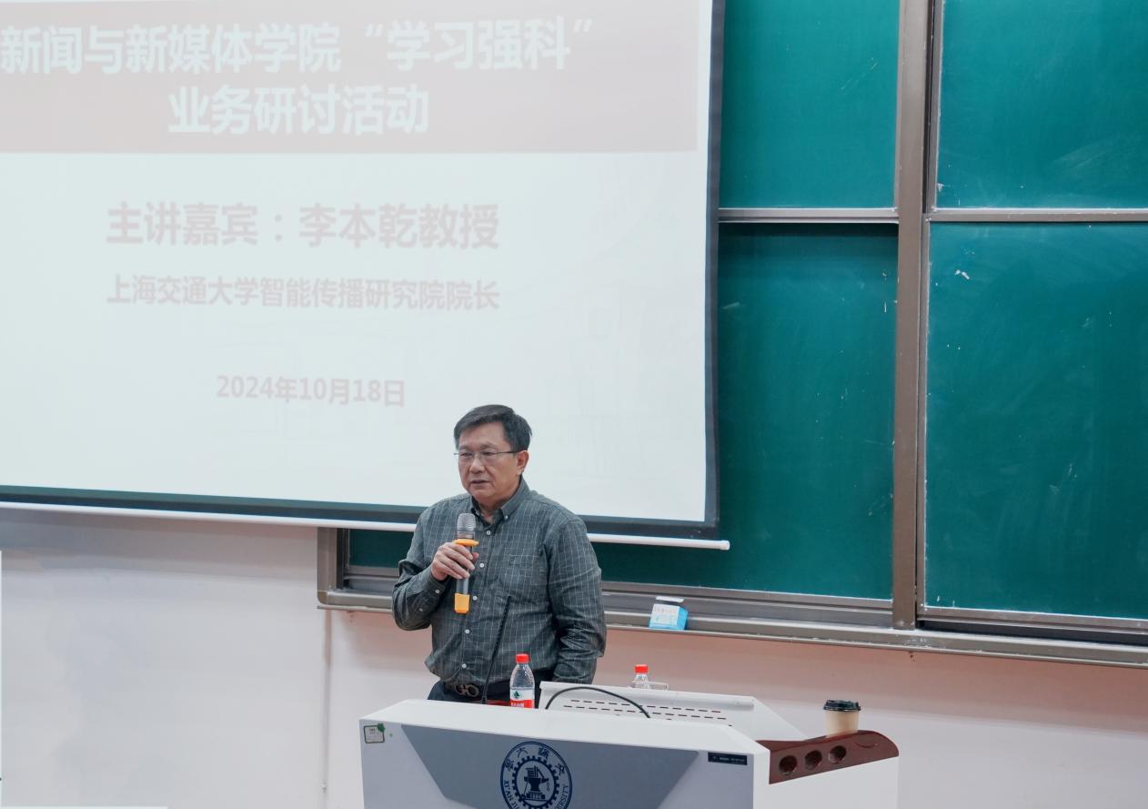 第二期“学习强科”业务研讨活动在西安交大兴庆校区中三楼1300教室成功举行。本次活动以“智能时代的新闻传播学科建设与科研创新”为主题,特邀上海交通大学智能传播研究院院长、国家级高层次人才李本乾教授担任主讲嘉宾,学院全体教工、全体博士生参加学习。活动由副院长孙鹤立教授主持。