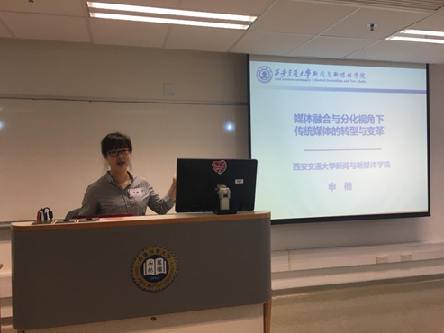教师申楠围绕“互联网时代传统媒体的分化与融合”主题做学术报告。她认为,互联网技术的发展改变了传统意义上的媒体渠道与内容的定义,传播渠道的多元化、扁平化,打破了传统媒体时代自上而下的“传-受”模式;而互联网作为信息内容承载平台,也因为受众需求多元化、信息来源非权威性等特点,使得信息内容较之以往产生了几何形级数增长。在媒体技术迅速发展的今天,传统媒体需要突围,就必须在了解受众需求的基础上,挖掘自身价值与存在意义,重新定位,方能成功。