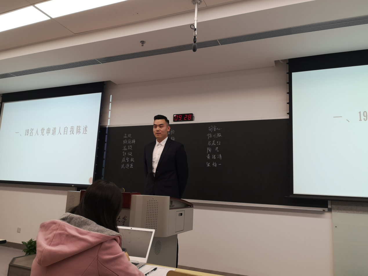 大会第一项议程,18名递交入党申请书的同学严格按照接收入党积极分子的组织程序进行依次发言,从入党动机、本人履历、现实表现等方面向支部成员做了详细汇报,表达了自己对党的深刻认识和入党的强烈愿望。带领院队夺得人文社科类篮球比赛冠军的徐川傲说道“人这一辈子一定要坚定信仰,尽管专业训练和比赛很累,但结束后我还是会按时代表院队参赛,因为我愿竭尽全力为我院的荣誉添砖加瓦”。经过党员同志们认真聆听、慎重考量和不记名投票,最终确定徐川傲等10名同学符合积极分子培养条件。