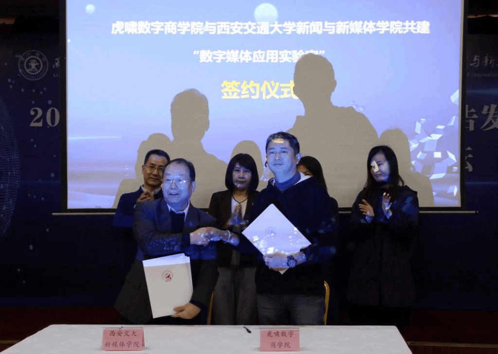 院长李明德与虎啸数字商学院袁俊签约共建“数字媒体应用实验室”。