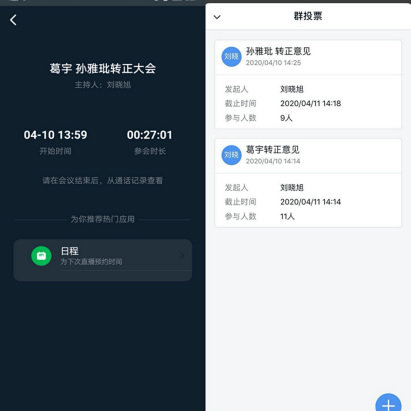 2020年4月10日14时,硕7094、8086党支部利用钉钉APP召开线上党员转正大会,以视频会议的形式讨论了葛宇和孙雅玭两名预备期满的党员转正问题。支部书记刘晓旭主持了会议。