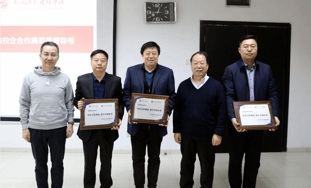 为感谢西安博达软件股份有限公司、西安鹏胜教育科技有限公司、美林数据股份有限公司对学院工作的支持,以及为学院学科建设发展所做出的的贡献,特授予“校企合作典范”荣誉称号。三位企业领导上台领奖并发表讲话,表达了对学院的感谢,更表示未来会加强与学院的合作及对学院工作的支持,博达软件技术总监陈宁分享了博达软件的融媒体技术,期待与学院进一步交流。