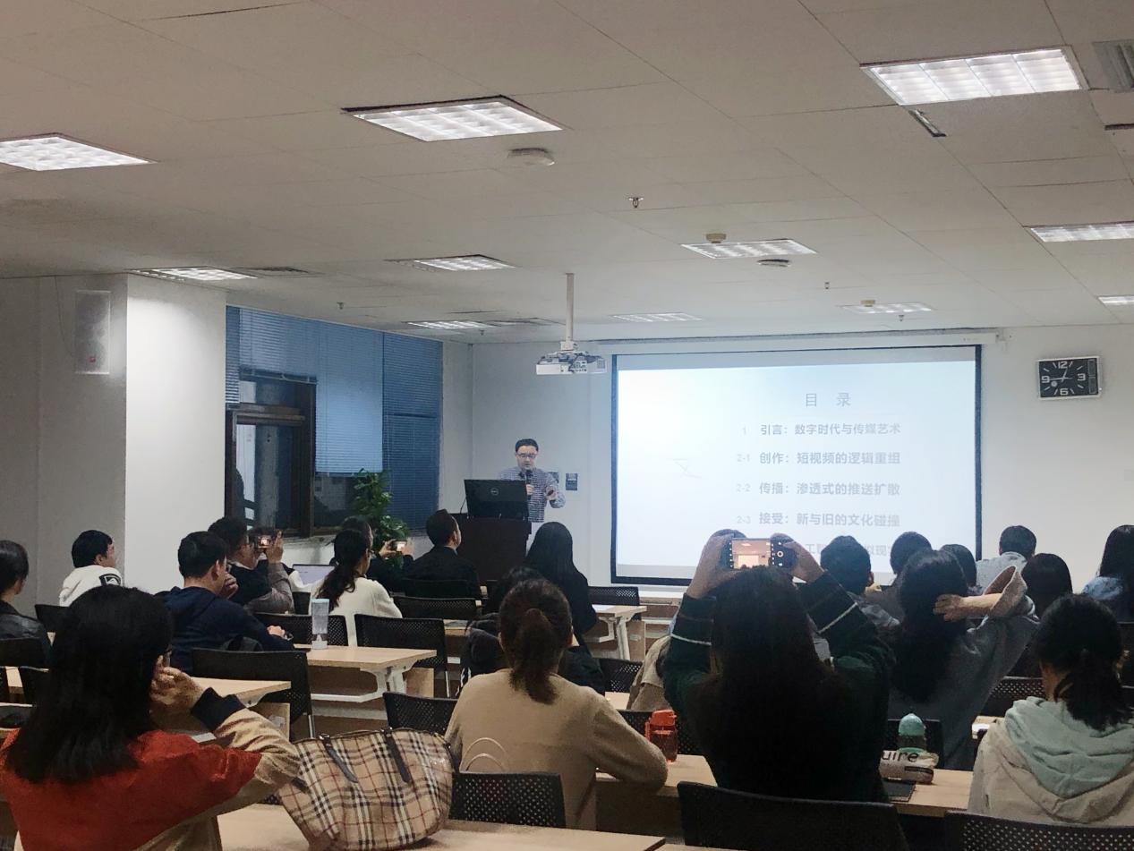 随后,刘老师按照传媒艺术“创作”“传播”“接受”的逻辑顺序,详细论述了现下短视频的创作重组、渗透式的推送扩散及新旧文化间的碰撞。期间多次播放相关网络视频,在丰富讲座内容的同时也调动了现场气氛。其中2021年央视网络春晚老年合唱团演唱歌曲《少年》的视频也成了当晚的“爆点”,通过视频观看,现场师生意识到了固有的传播经验或许将成为发展障碍,短视频要想登上融媒时代的“风口”,就必须对其创作形式、叙事手法进行大刀阔斧的改革创新,这也是传统文化得以受到大众尤其是青年群体青睐的重要途径。