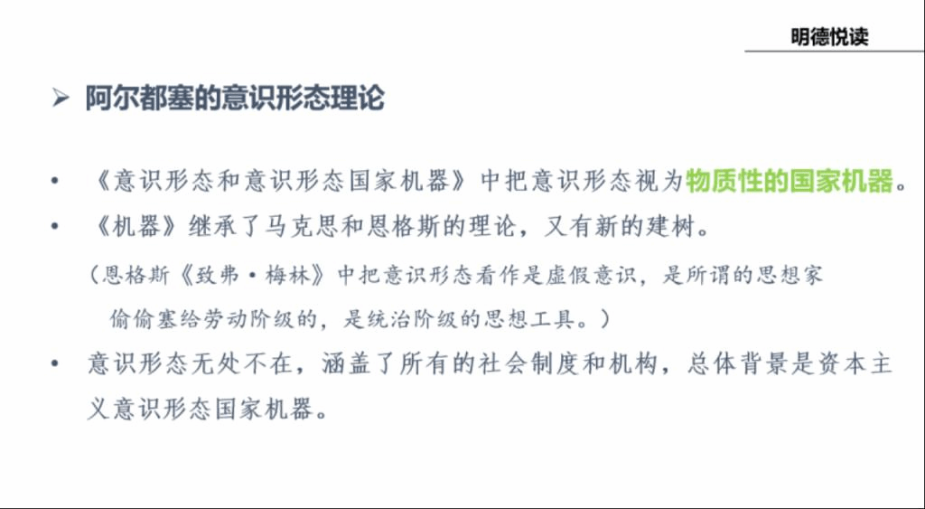 《机器》的核心内容大致是,意识形态和劳动力的再生产有直接的关系,劳动力的再生产需要的不仅是它的技能的再生产,同时也是对既有秩序的规则的顺从;提出意识形态国家机器,他认为马克思所说的国家机器不是意识形态国家机器,ISAs不光是政府、军队、警察、监狱等镇压性质的国家机器,还包括宗教、学校、教育、家庭、传播、文化等潜移默化的机构;意识形态的核心作用是主体的生产,但主体的生产不是通过观念和思想灌输而成的,是通过不断重复的物质性质询实践实现的——即意识形态的物质性。