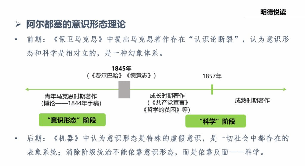 阿尔都塞一生提出过两个版本的意识形态理论。前期是在《保卫马克思》中提出马克思著作存在“认识论断裂”,认为意识形态和科学是相对立的,是一种幻象体系。后期他是在《机器》认为意识形态是特殊的虚假意识,是一切社会中都存在的表象系统;消除阶级统治不能依靠意识形态,而是依靠反面——科学。