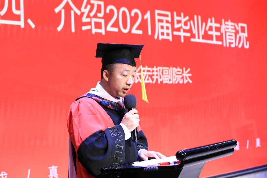 隆重举办2021届学生毕业典礼暨学位授予仪式,院党总支书记兼院长李明德,党总支副书记韩博,副院长张宏邦、马忠,崇实书院院务副主任段继超,硕士生导师,本科生班主任,校友代表,家长代表等参加,党总支副书记韩博主持典礼。
