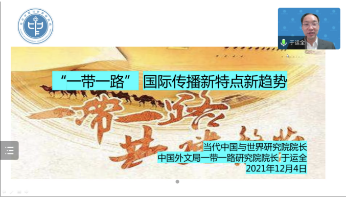中国外文局当代中国与世界研究院院长于运全在线进行“‘一带一路’国际传播新特点新趋势”的主题分享。他从中老铁路开通仪式切入,提出构建“一带一路”国际战略传播体系:首先要围绕“一带一路”国际合作,进行价值引领;其次要加强国际传播理论与实践研究;最后要针对“一带一路”建设国际传播的现实问题进行深入探讨。