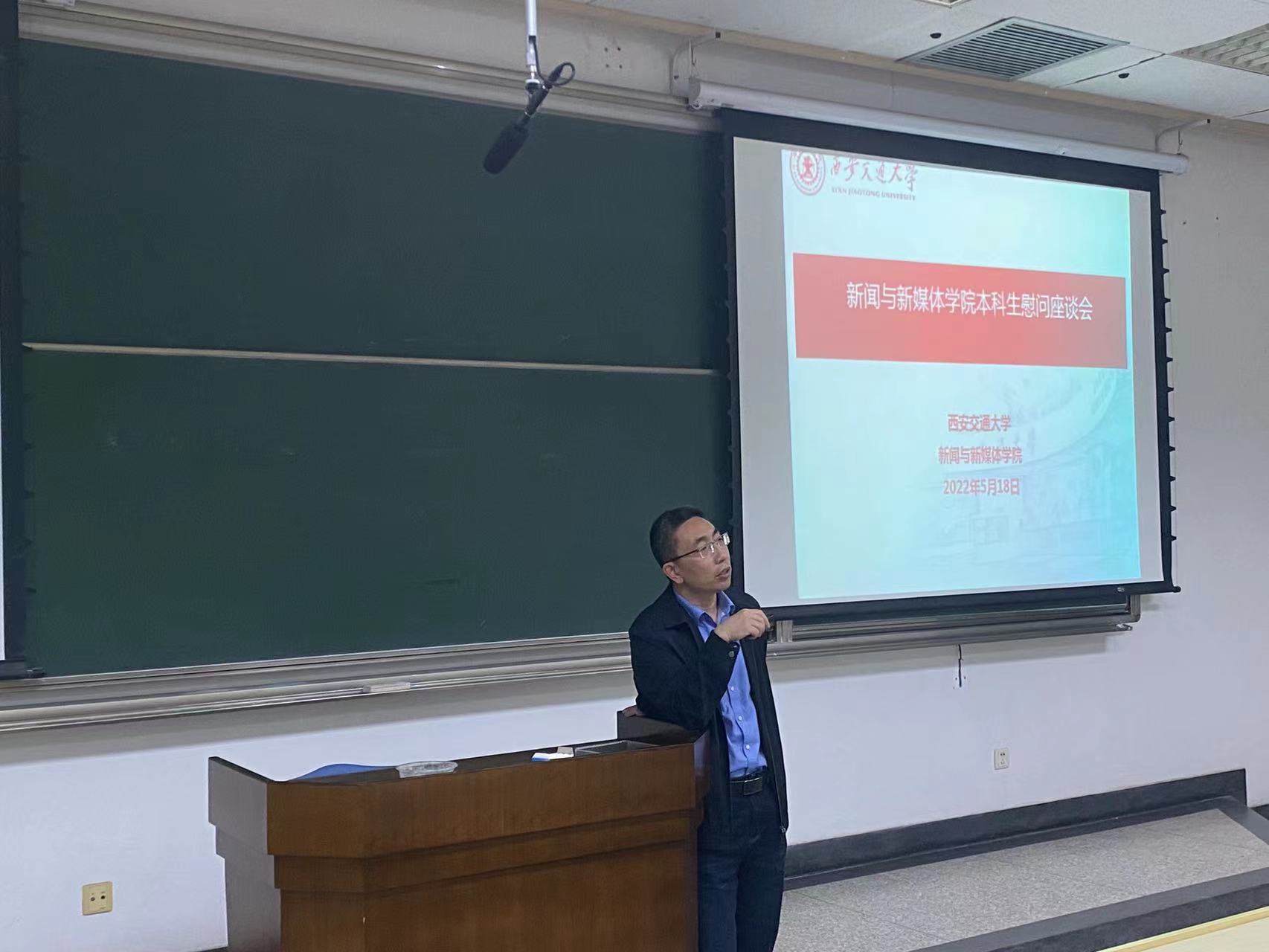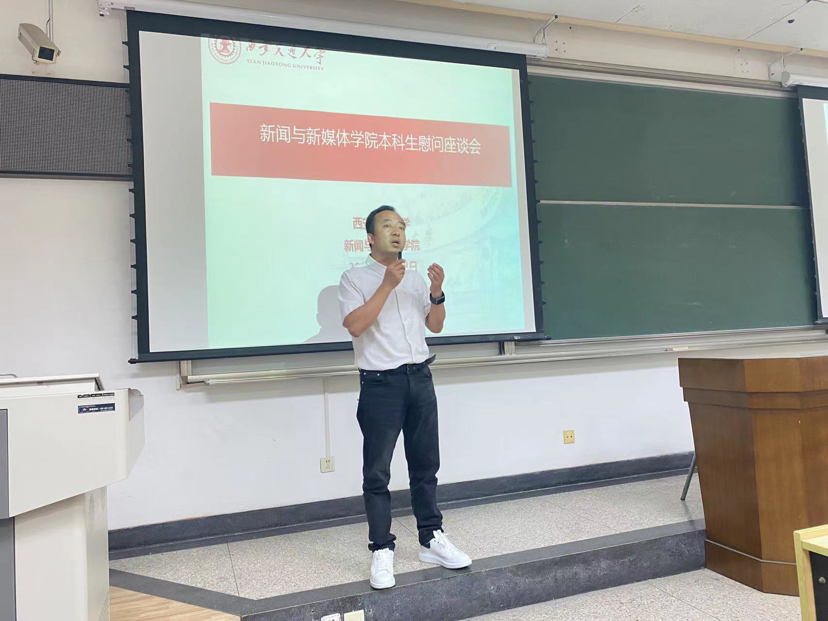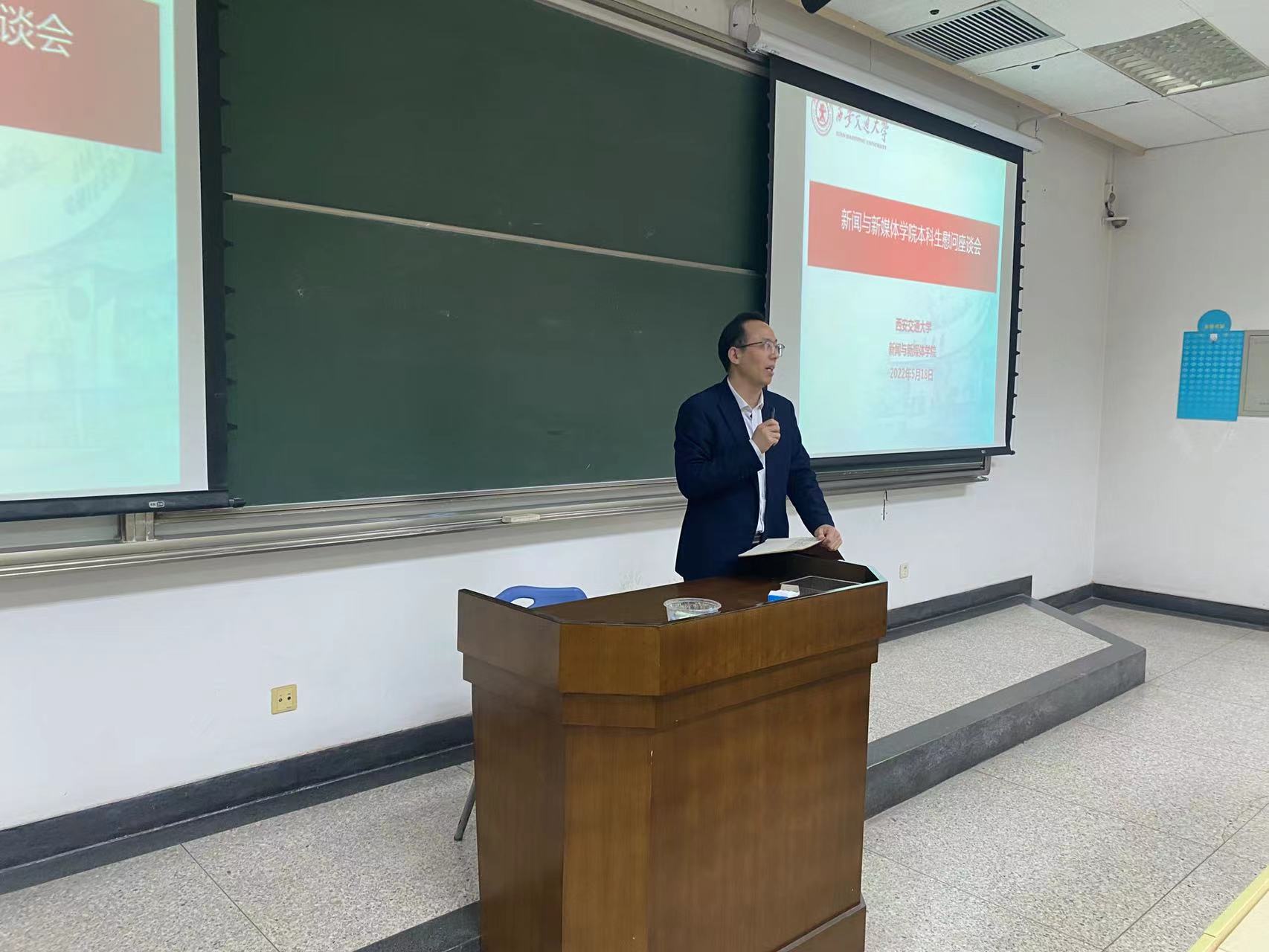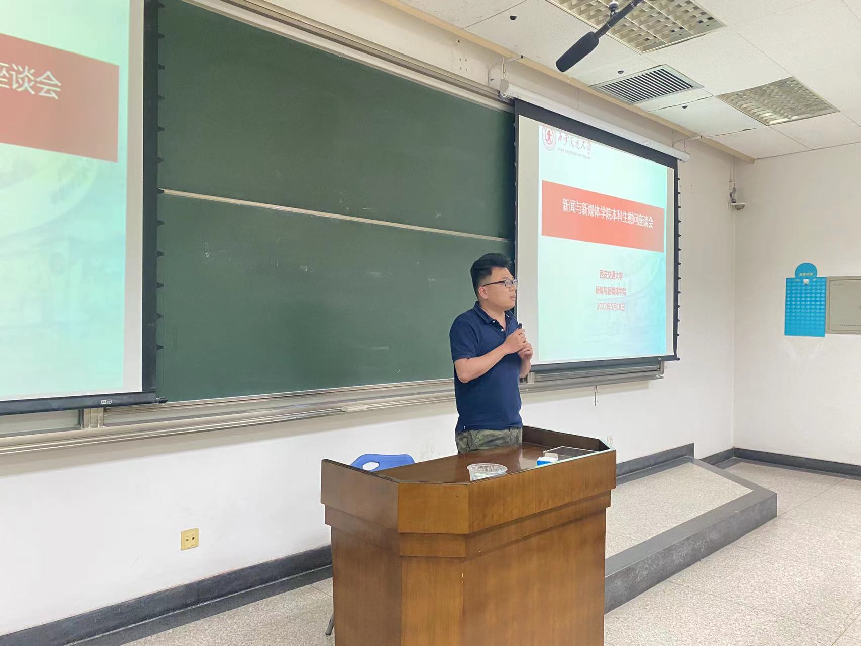 系主任代表吴锋老师他简单介绍了传播系的师资力量和科研教学情况,他表示乐于为各位同学未来升学、就业提供帮助,欢迎各位同学经常到传播系转转。