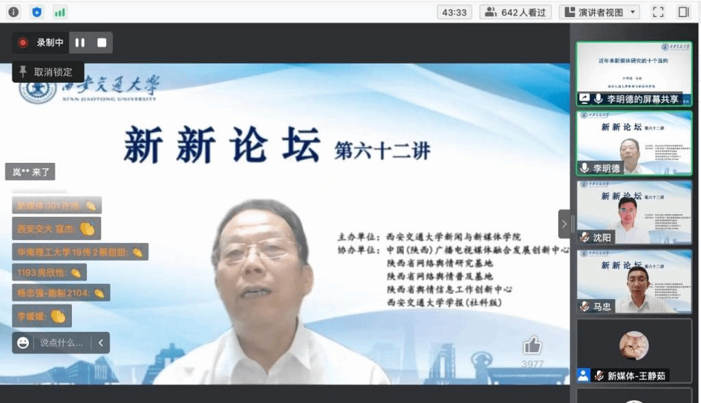 李明德教授作为论坛改版的首期嘉宾,两位专家围绕新闻传播前沿问题分别以“元宇宙的发展与挑战”及“新媒体研究的十个面向”为主题开展了精彩讲座,吸引了来自校内外学界、业界等近700人次的热情参与。