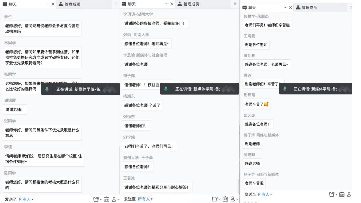 学术讲座后,学院张收鹏、王静茹、孙艳婷三位老师从学院实习实践基地及实验室建设、校院奖助学金政策、研究生培养课程体系及研究生毕业就业基本情况等方面向营员们进行了答疑、分享。