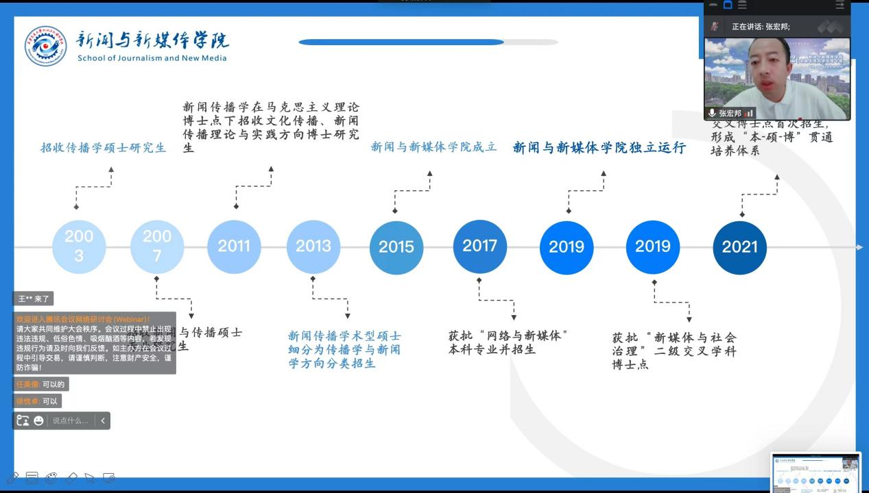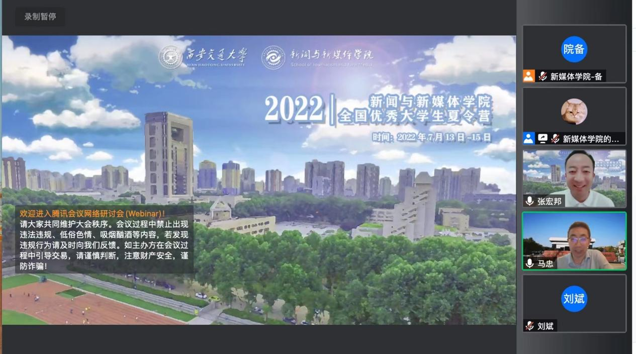 7月13日上午,夏令营开营仪式在云端举行。学院党总支书记、院长马忠教授做开营致辞,学院教学副院长张宏邦老师介绍学院基本情况,新闻系刘斌老师、传播系刘婵君副教授、新媒体系陈积银教授等教师代表参加,并进行了学术分享。