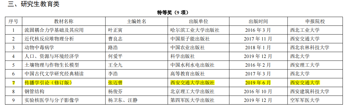 张迈曾教授、李明德教授等主编教材《传播学引论(修订版)》荣获特等奖。