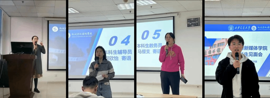 学院团委书记范晓莹,崇实书院辅导员何欣怡,学院教务员马樱支分别以不同的主题表达了对同学们的殷切期望,希望同学们勤加学习、积极进取,主动把握提升自我的机会,并祝愿同学们能够在不断的学习和实践中实现个人理想。新媒体2202班班长罗永睿作为学生代表发言,表示从这次见面会中收获颇多,会带着思考,珍惜大学四年时光,不负老师们的期待。