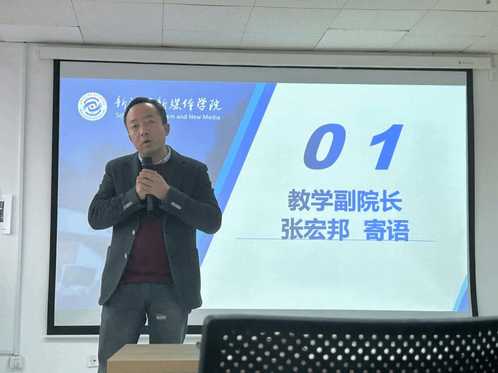 张宏邦副院长首先向大家传达了近期教学领域的喜讯,“网络与新媒体”本科专业获批国家一流专业建设点,《传播学引论(修订版)》荣获陕西省2022年职业教育和高等教育优秀教材奖特等奖。随后以“自信,自强,自律”三个关键词为主题展开,寄语大家“要对自己的学校、专业保持自信”并且要“相信自身实力、拥有伟大抱负”,他强调作为新媒体专业的学生,要担当起“讲好自己,国家,学科故事”的民族大任,同时坚持自律,才能实现理想。