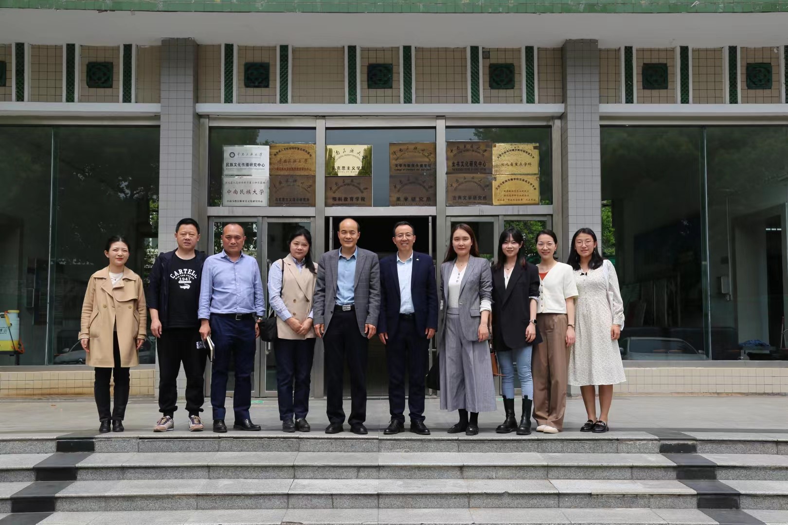 学术团队到中南民族大学文学与新闻传播学院调研学习,双方就学科发展、科学研究、人才培养等问题,及如何进一步加强院际合作开展座谈研讨。中南民族大学文学与新闻传播学院院长陶喜红教授,副院长陈峻俊教授,新闻系主任郝永华教授,实验室主任吴涛,学院办公室主任陈琳;有爱爱