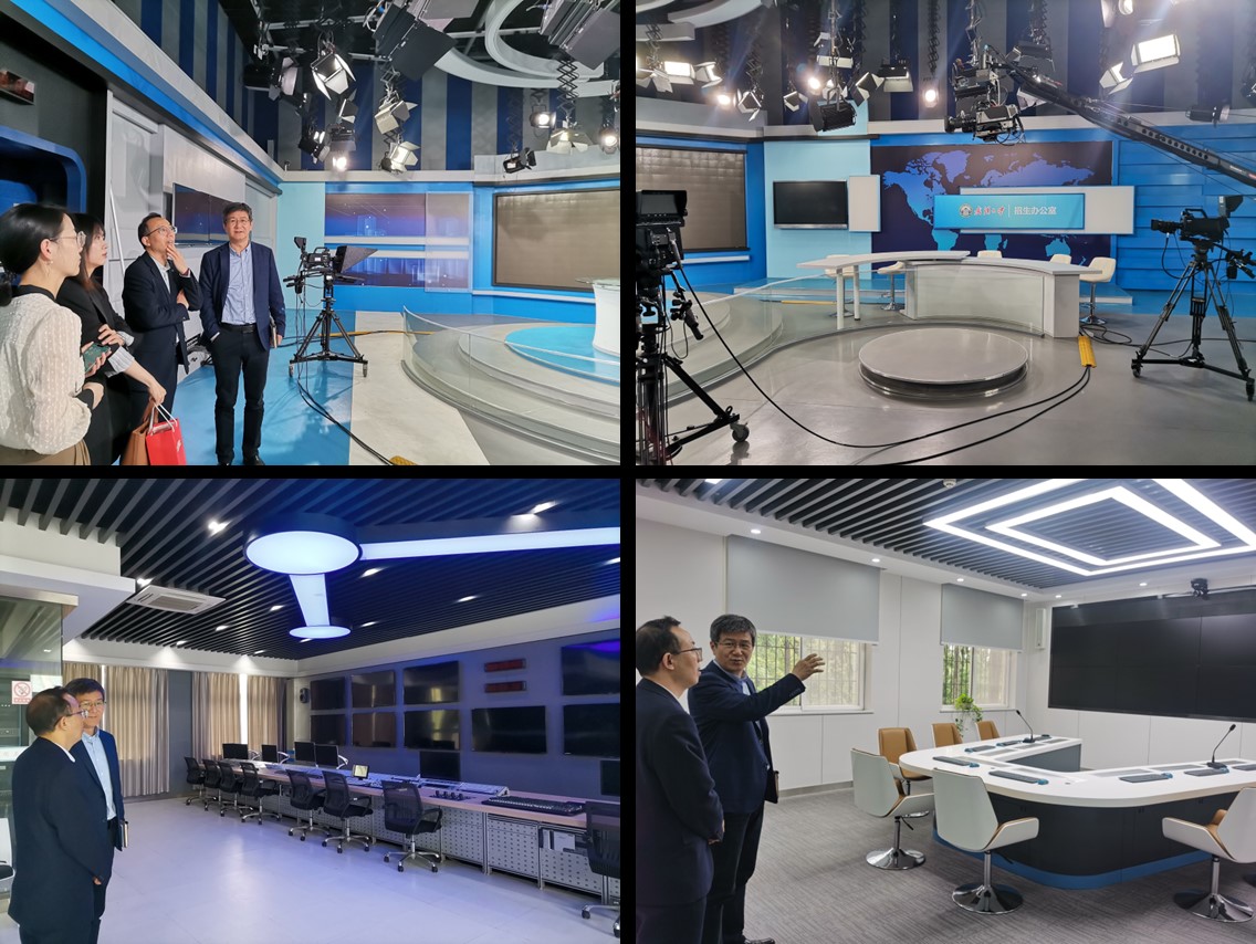团队一行在洪杰文副院长的带领下,参观了武汉大学新闻传播学国家级实验教学示范中心——融媒体实验室的建设情况,包括专业演播厅、多媒体报刊编辑实验室、广播电视非线性编辑实验室、录音室、摄影实验室等。