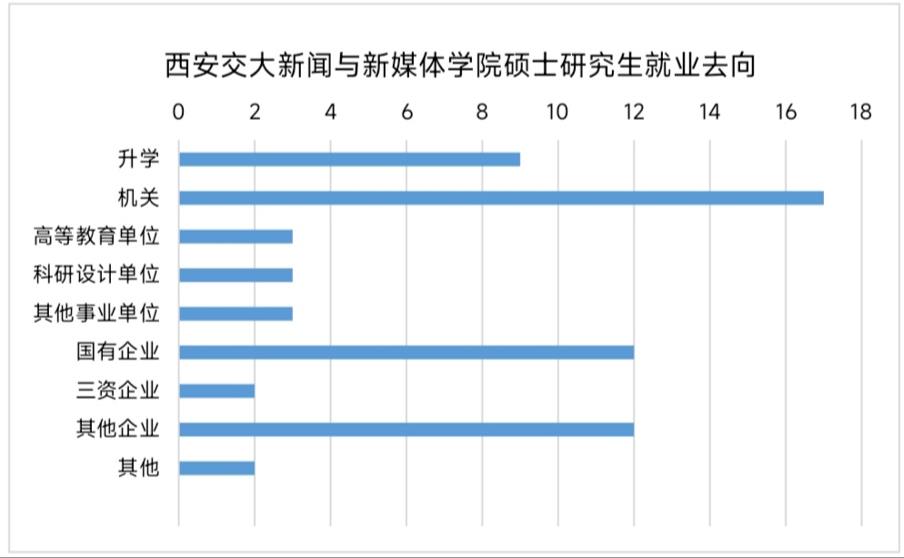 共有63名硕士毕业生。就业去向覆盖升学读博、党政机关、高等教育单位、科研设计单位、其他事业单位、国有企业、三资企业及其他企业,大多数毕业生从事新闻传播相关“对口”专业工作。其中,升学继续攻读博士学位的9人,主要包括中国人民大学、复旦大学、有爱爱