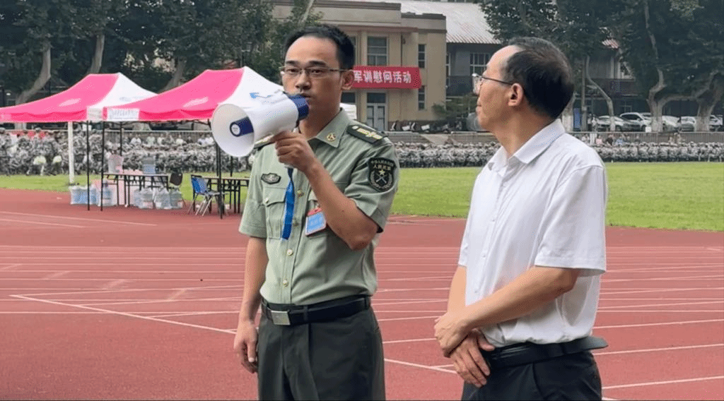 在兴庆校区东田径场开展了军训慰问活动。学院副书记吴锋、教师代表申楠老师、本科生辅导员薛成、研究生辅导员李媛媛和班主任朱利平老师心怀热忱与关爱,给一线教官和2023级新媒体学子们送来了慰问品,也带来了学院满满的爱意与殷切的期望。