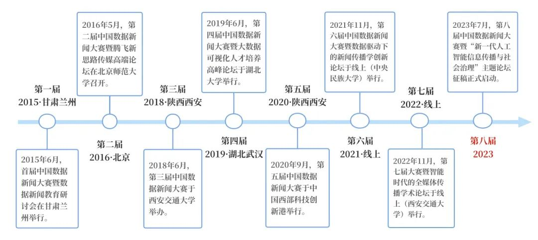 2015年6月,首届中国数据新闻大赛暨数据新闻教育研讨会在甘肃兰州举行。2016年5月,第二届中国数据新闻大赛暨腾飞新丝路传媒高端论坛在北京召开,赛事吸引了国内120余家机构报名,34.3万余人投票。2018年6月,第三届中国数据新闻大赛于陕西西安举办,共有业界学界300多个团队1500余人报名参赛,收到全球各地共计360余件作品。2019年6月,第四届中国数据新闻大赛暨大数据可视化人才培养高峰论坛于湖北武汉举办,参赛队伍共726支,网络点击量近159万人次。2020年9月,第五届中国数据新闻大赛决赛暨大数据时代的新闻教育研讨会于陕西西安的中国西部科技创新港举行,共有800余支队伍报名参赛。2021年11月,第六届中国数据新闻大赛暨数据驱动下的新闻传播学创新论坛于线上云平台举行,共计900余支队伍参赛报名。2022年11月,第七届中国数据新闻大赛暨“智能时代的全媒体传播”学术论坛成功举办,共收到1000余支队伍5000余人报名,网络投票总热度达300余万人次。