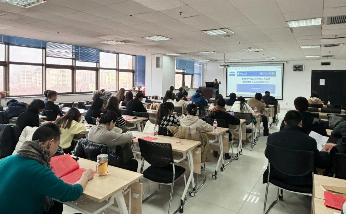 在主E1104会议室组织召开2023年度工作总结暨领导班子及成员述职述廉大会。学院全体教工参会,院长兼党总支书记马忠主持会议。
