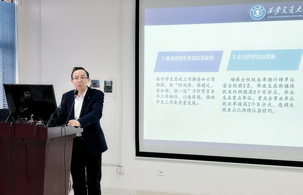 副书记吴锋就2023年学生工作作简要汇报。他表示,学院始终围绕学校中心工作,聚焦学生思想引领,以服务研究生成长成才为主线,深入开展各类调查研究,切实解决学生急难愁盼问题,有效化解各类学生矛盾问题,工作扎实、成效显著。其中就人才质量稳步上升、毕业生就业率连续三年名列前茅、社会实践品牌影响持续扩大、校际合作交流模式不断发展等亮点进行展示。他表示未来将继续以学生发展为本,做好思政教育和学生管理工作。