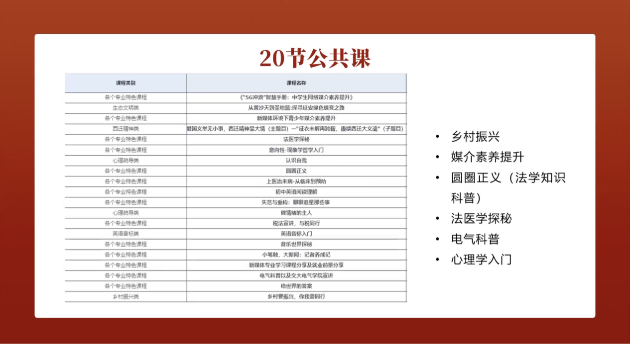 结合往期经验和学生反馈,本次支教活动将更加注重公共课的开设,创新性地推出了一系列公共课,涵盖乡村振兴、媒介素养、提升圆圈正义等内容。致力于开阔村镇学生眼界,激励学生筑梦逐梦。本期公共课特别邀请了两位学院教授与本科生从“5G冲浪”手册追星的示范与重构,记者养成记等方面为同学们带来生动有趣的课程,希望能够立足于社会环境,启蒙村镇青少年媒介素养认知。
