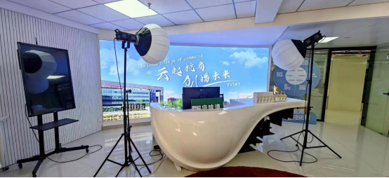 调研团队参观了杭州商学院直播共富工坊,双方就当前杭商院创业学院直播基地建设的运营模式进行了深入探讨。