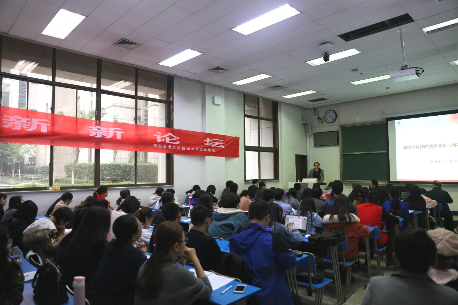 “新新论坛”,吴教授的讲座以“新媒体科技的国际搏弈与传媒人才培养创新”为主题,主要从新媒体科技背景下的国际博弈和传媒人的社会担当与人才培养两个角度出发,为交大师生带来了一场精彩纷呈的前沿报告。讲座由有爱爱