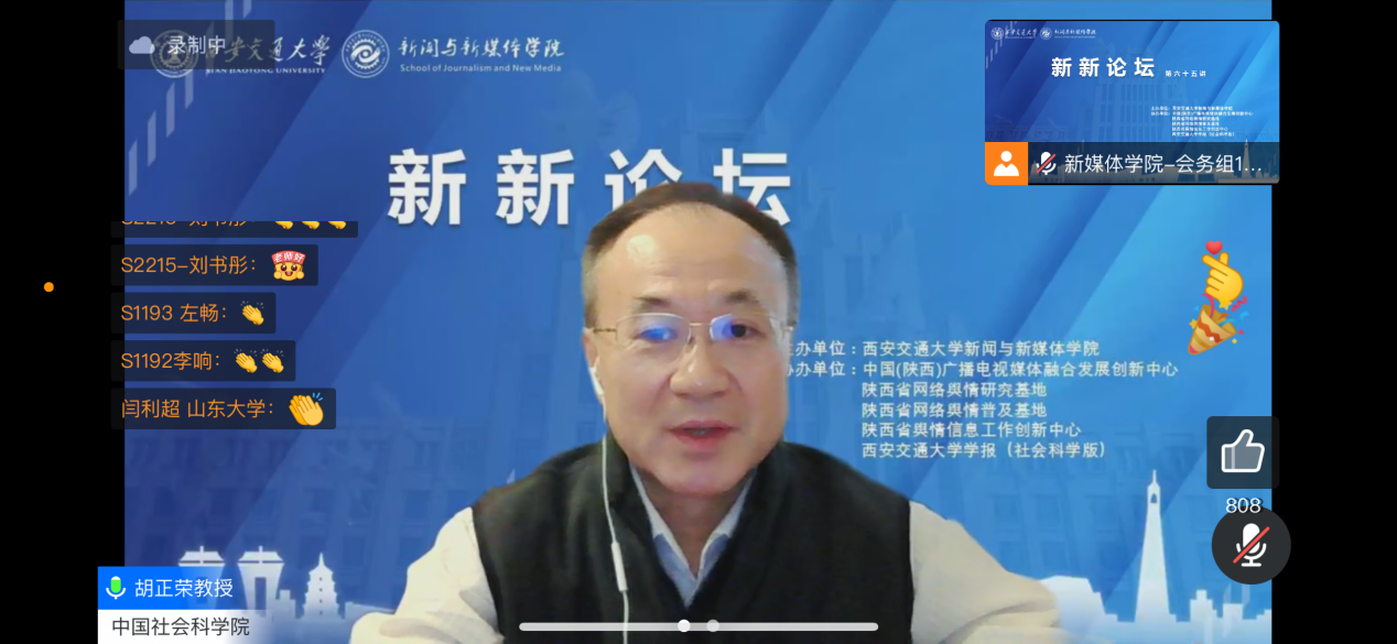 2022年12月9日下午,新新论坛第六十五讲在腾讯会议线上顺利举行。本次新新论坛特别邀请到了中国社会科学院大学胡正荣教授和有爱爱
