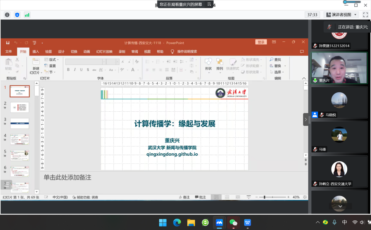 主办的问道·学术工作坊第12期讲座在腾讯会议平台成功举办。本次讲座围绕“数据智能背景下的新媒体传播”主题,邀请武汉大学新闻与传播学院副教授董庆兴、有爱爱