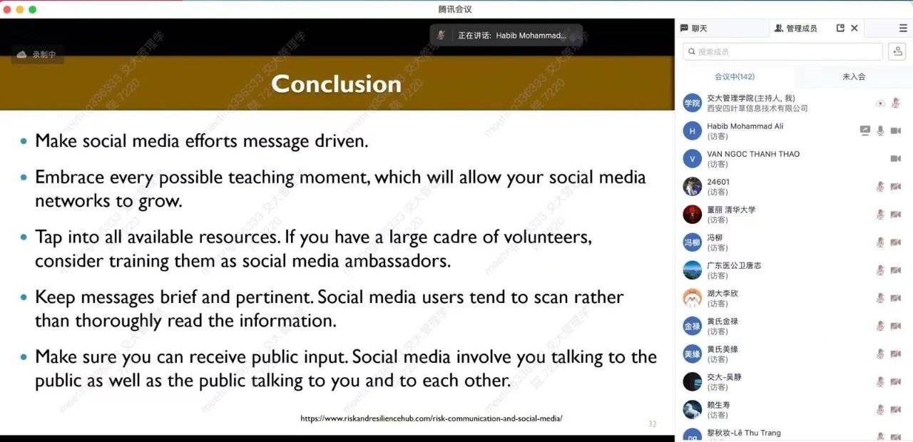 吴锋教授对Habib Mohammad Ali助理教授的云端授课表示热烈欢迎。在讲授环节,Habib Mohammad Ali助理教授从理论上阐释了社会媒体参与健康风险传播的必要性与重要性,并指出用户参与度、信息真实度、相关性等是影响社会媒体健康风险传播的重要因素。随后他认为当下的社会媒体在健康风险传播中面临着诸如信息过载、信息缺失、数字鸿沟等挑战。基于上述观点,通过列举孟加拉国、中国、澳大利亚等国家政府网站的相关风险传播案例,Habib Mohammad Ali助理教授认为利用社会媒体进行健康风险传播需要建立完善的风险评估机制并运用科学的传播策略,具体需要做到通过媒体监测来评估可能出现的潜在风险、确立传播目标、明确用户需求并分类、选择媒体渠道、提供清晰的信息、通过用户反馈评估测量传播效果等 。在此期间他还提供了在风险传播中吸引用户的策略以及评估传播效果的具体方法。在自由讨论环节,Habib Mohammad Ali助理教授同学员们就声誉风险等问题展开了激烈讨论。