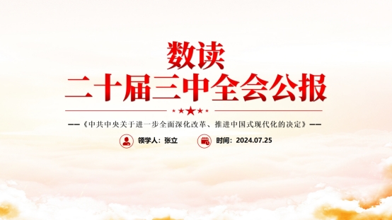 党委委员、院长助理张立以《数读党的二十届三中全会公报》为主题领学全会精神。党的二十届三中全会对进一步全面深化改革、推进中国式现代化作出战略部署。张立从一个总目标、“七个聚焦”、贯彻“六个坚持”、进一步全面深化改革的14个重点领域等方面对《中共中央关于进一步全面深化改革、推进中国式现代化的决定》(后简称《决定》)作讲解,按照总论,经济、政治、文化、社会、生态文明、国家安全、国防和军队等方面部署改革,加强党对改革的领导、深化党的建设制度改革、党风廉政建设和反腐败斗争等三大板块、15部分、60条要点带领与人人员速览党的二十届三中全会《决定》重点内容。