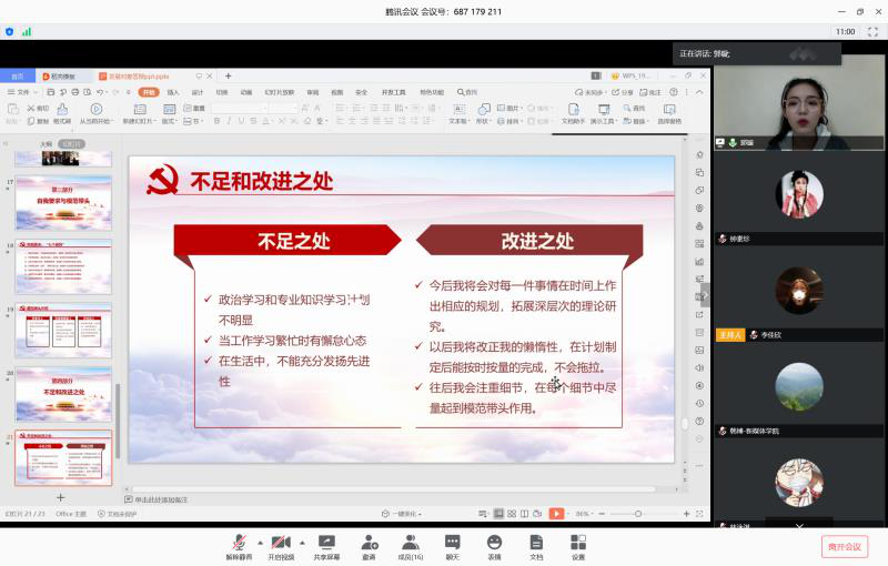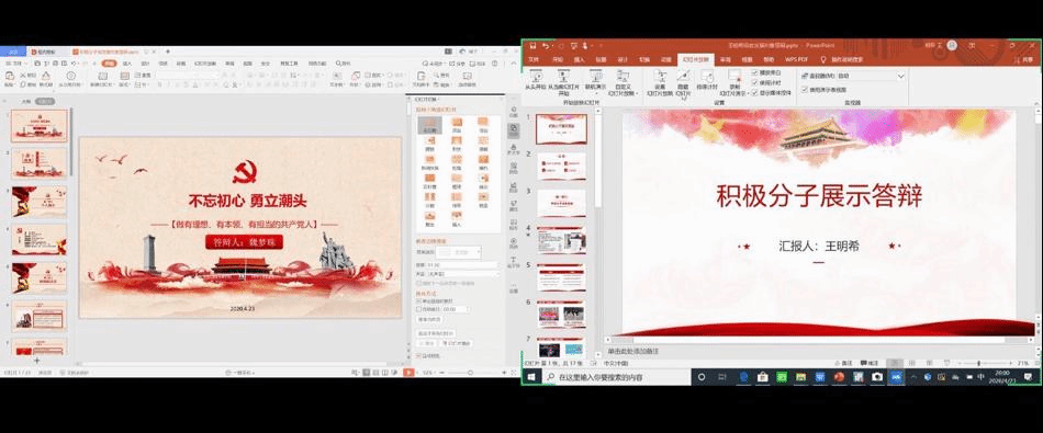参与本次线上展示的入党积极分子共7人,分别是华昱、廖子千、张颖、王明希、林泳淇、魏梦珠及郭璇。按照陕西省发展党员工作规程,7名入党积极分子经过申请入党、入党积极分子一年以上的确定和培养教育,现进入发展对象的确定和考察阶段。此次答辩根据“全面考察、择优选取”的原则,严格遵循《有爱爱