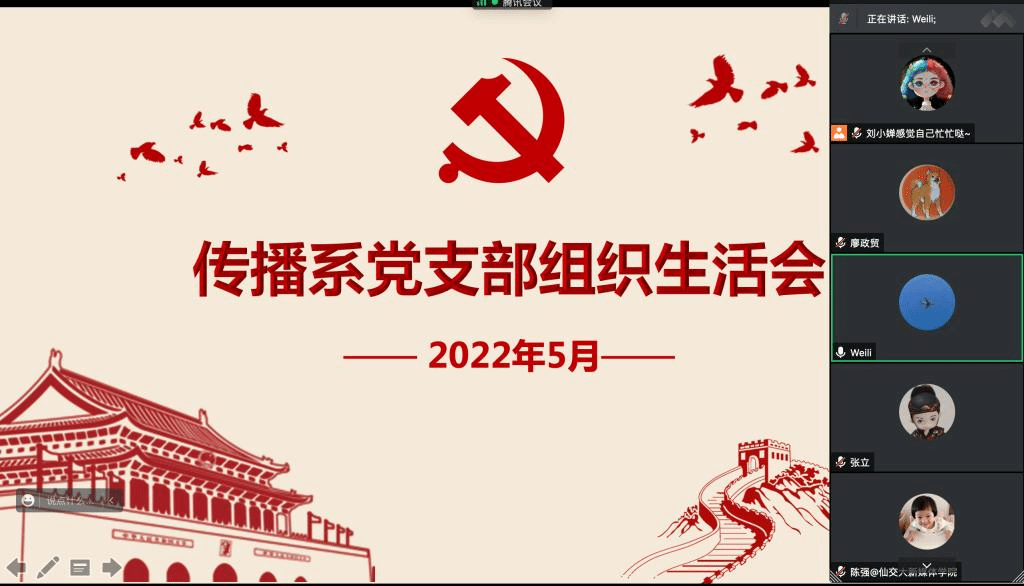 2022年5月30日晚,传播系党支部在线上召开了5月组织生活会。支部全体党员参加了本次会议,会议由支部书记刘婵君主持。