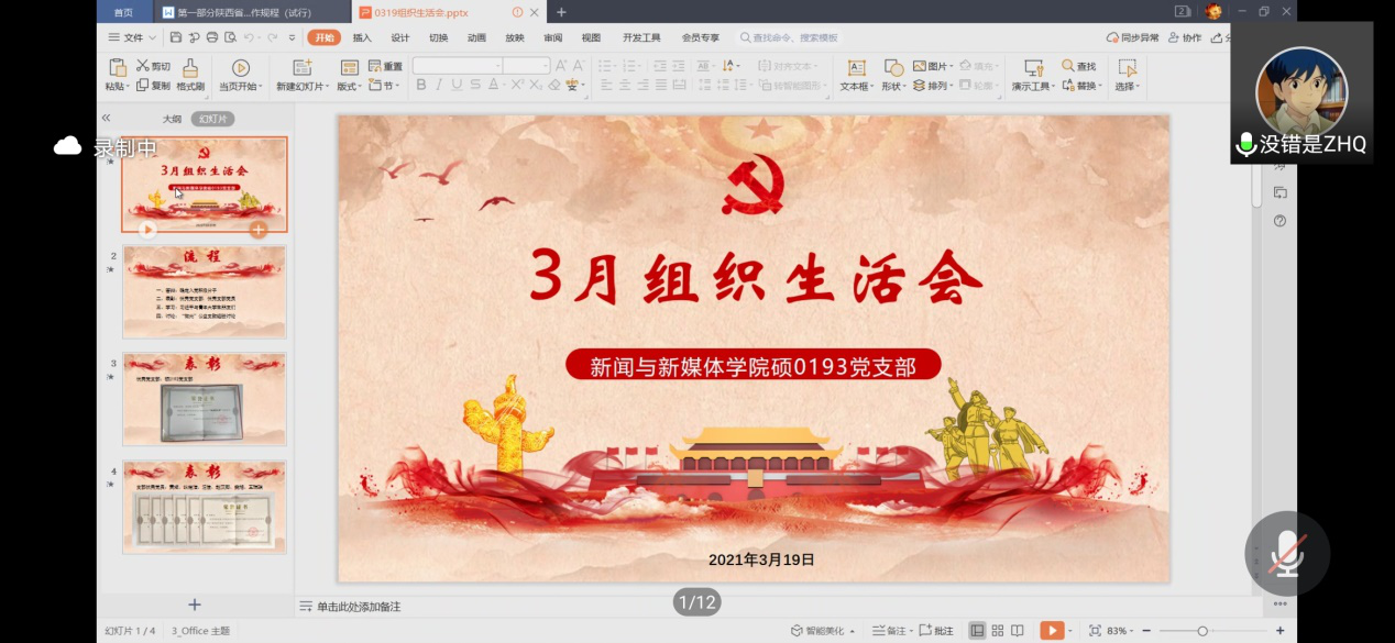 3月19日,硕0193党支部组织召开3月组织生活会,会议围绕入党积极分子答辩、优秀党支部及支部党员表彰、《习近平与青年大学生朋友们》学习巩固、“微光”支教经验总结与讨论等四项内容展开。支部成员共计22人参加线上会议,刘娜等12名同志进行入党积极分子线上答辩,会议由支部书记黄斌主持。