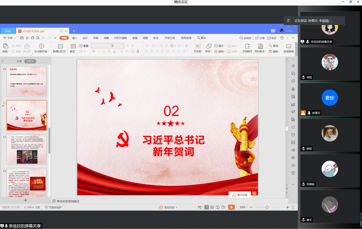 为进一步深刻领会党的百年奋斗重大成就和历史经验,支部副书记李佳欣带领大家学习了习近平总书记新年贺词的文本与视频。支部成员陶艺对蕴含其中的人民情怀感受颇深,她谈到,“在新年致辞中,习近平总书记提到最多的是人民。与西方国家相比,我们国家从历史上就非常重视人民,领导者重视人民的评判。人民在政治中发挥着怎样的作用是我们每个人值得思考的问题。作为青年党员我们更要主动担当作为,用青春奋斗致敬党的百年奋斗史。