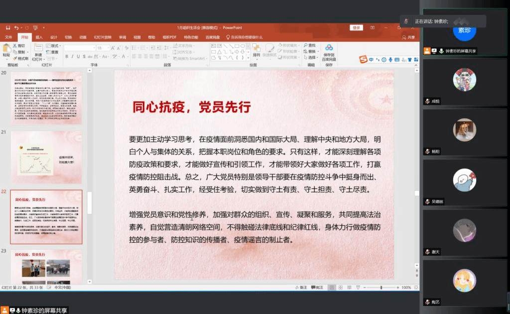 会议伊始,党支部书记钟素珍带领大家学习领会习近平总书记关于疫情防控工作重要指示精神,并学习回顾孙春兰副总理调研指导西安疫情防控工作情况,呼吁支部党员、团员发挥好带头作用,增强党员意识和党性修养,自觉营造清朗网络空间,身体力行做疫情防控的参与者、防控知识的传播者、疫情谣言的制止者,努力让党旗在防控疫情斗争第一线高高飘扬。随后,与会成员就“我的封校生活”和作为新时代青年党员可以在疫情防控中发挥什么样的作用等展开了讨论。刘佳怡向大家介绍了自己在疫情期间的封校生活,她表示疫情虽然缩小了活动半径,但也减少了外部干扰,我们逐渐得以更好地专注于自己的学习或者兴趣爱好。张杨一则结合自己的实习和学学习经历,就疫情之下的舆论与城市形象发表了自己的看法,“看到社交媒体平台关于西安的负面消息我感到很痛心、无奈。舆论的力量对于城市的形象与发展有很大的影响。西安负面新闻频上热搜除了城市的内涵建设,其一大助力也是相关部门的舆情处理能力。”