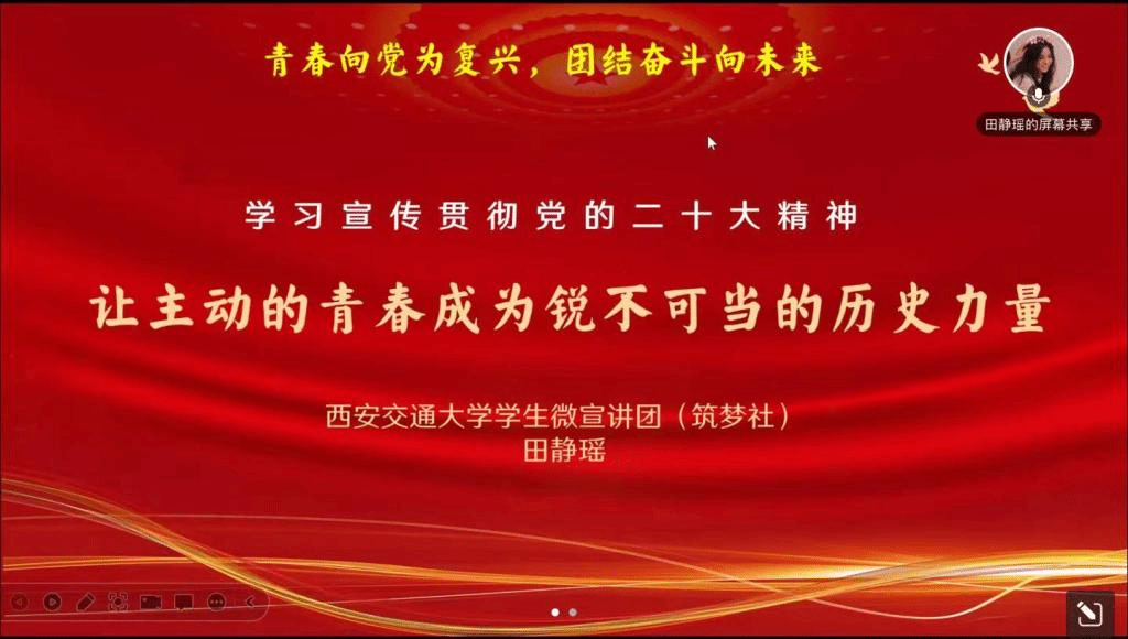 学生微宣讲团(筑梦社)社长、马克思主义学院的田静瑶带来《让主动的青春成为锐不可当的历史力量》主题宣讲。本次活动主要由二十大精神学习、主题宣讲以及学习感悟分享三个部分展开,团支书余睿婕主持了本次会议。