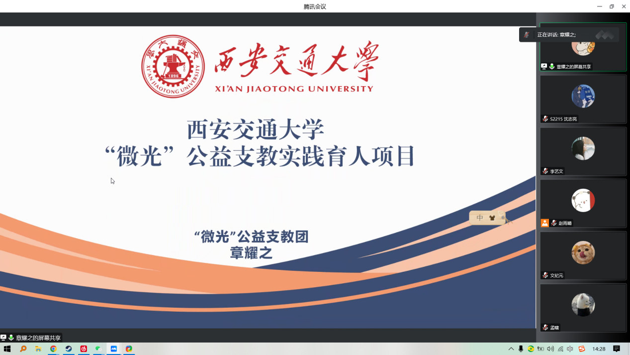 “微光”公益支教实践育人项目第四期负责人章耀之向同学们分享了社会实践的经验心得。他介绍了“微光”公益线上支教团的基本情况,并从实践背景、实践思路、实施过程、项目成效和经验启示五个方面向大家讲述支教团的运行过程和主要活动,号召大家积极参与进来。他强调,要“远谋划,树品牌,重传承”,建立起“微光”品牌,“为世界之微光,点亮村镇学生一盏灯”。
