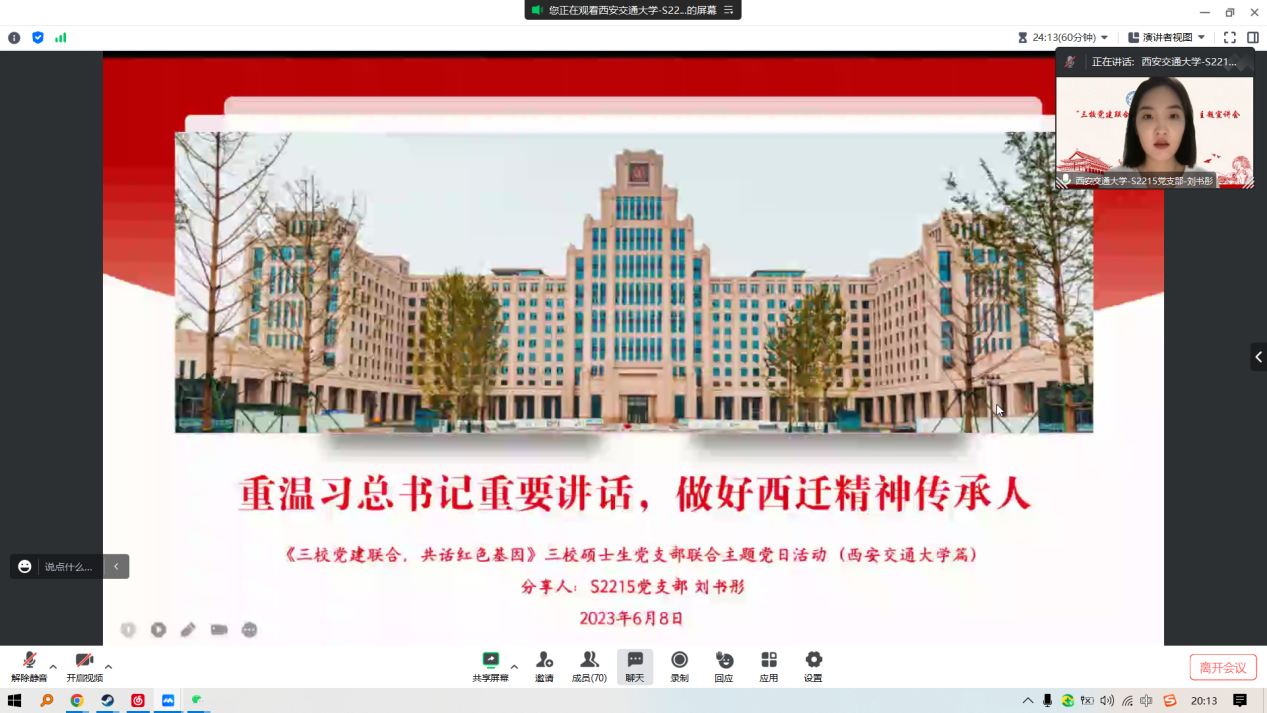 的刘书彤做了题为《重温习近平总书记重要讲话,做好西迁精神传承人》的主题宣讲。她首先为同志们介绍了西迁精神,即在1956年交通大学由上海迁往西安的过程中,生发出来的一种宝贵的精神财富,其核心是爱国主义。她还提到,当代的西交青年也同样在用行动传承和发扬着西迁精神,“大先生系列话剧”、“舞台上的校史课”原创话剧、“腾飞杯”科创竞赛,214名奔赴祖国西部边陲的研究生支教团,都是交大青年将“西迁精神”内化于心,外化于行的行动印记。