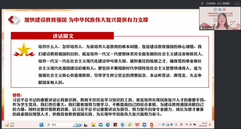 S2215党支部、大连理工大学人文与社会科学学部硕传播学与新闻学学生党支部、北京师范大学国际中文教育学院2022级专硕第二党支部联合开展了“三校党建联合,共话红色基因|学习习近平总书记重要讲话精神”主题党日活动。会议中,来自三所不同高校的80余名党员同志在线上共聚一堂,参与到本次党日活动的交流研讨之中。