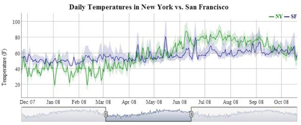 Dygraphs是一款快捷、灵活的开源JavaScript图表库,用户可以自由探索和编译密集型数据集。它具有极强的交互性,比如缩放、平移和鼠标悬停等都是默认动作。更棒的是,它还对误差线有很强的支持。Dygraphs也是高度兼容的,所有的主流浏览器都可正常运行(包括不受待见的IE8)。你甚至可以在手机和平板设备上使用双指缩放!