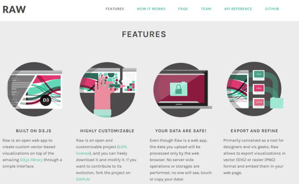Raw是一款开放的Web app,可以按需创作矢量图形可视化作品。它是使用LGPL许可(GNU Lesser General Public License -GNU宽通用公共许可证的缩写,许多自由软件(Free Software)使用GPL作为其授权声明,译注)的定制项目,允许随意下载并修改。但是Raw只是Web app,你所上传的数据只能用网页浏览器处理,因此没有实质性服务器端数据交互。你可将可视化作品导出为矢量图形(SVG)格式或者栅格化为(PNG)格式。