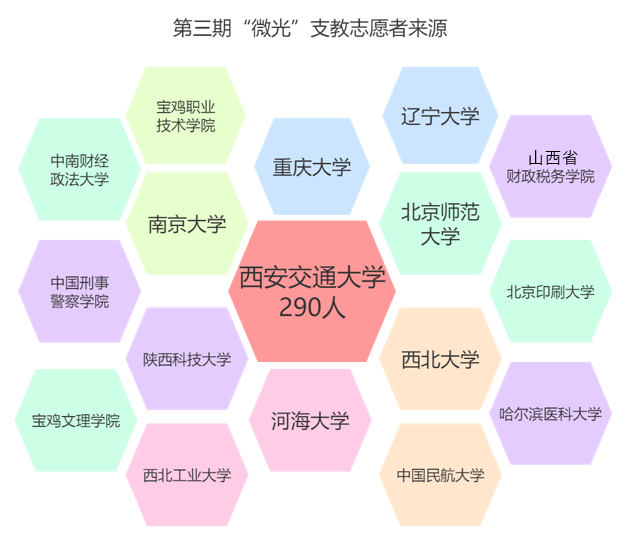 、南京大学、北京师范大学、西北工业大学、重庆大学等17所高校的超过300名支教志愿者,以保证“一对一”帮扶的顺利进行。此次支教活动的巨大规模是喜人的成就,也给组织方带来运作上的挑战。