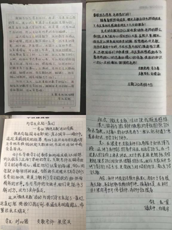 15天的陪伴转瞬即逝,转眼暑假已接近尾声,学生们开学的步伐越来越近,短暂的相处也迎来了告别。为了表达对志愿者的感谢,村镇学生们通过手写信的方式说出了心里话。学生刘煜涵说:“这次的支教活动让我收获极多,老师那么多付出点亮了我内心深处的小火苗,虽然只是微光,但也足以照亮我向前走的路。”不止刘煜涵,在支教结束之际,越来越多的同学们通过或手写、或打字的方式表达了对志愿者们的感激之情。在杨雪峰发给支教志愿者张明明的感谢信中,他写道:“感谢老师的一节节课程。之前我写作文还是流水账,现在我能写得丰富多彩,这多亏老师的指点,谢谢老师!”学生们的一封封手写感谢信让这群年轻人兴奋不已,在支教的过程中,志愿者与学生们之间不仅是老师与同学的关系,更是彼此可以交心的朋友。