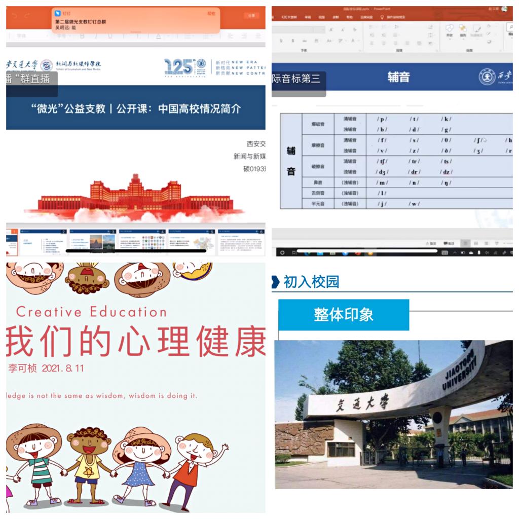 除了一对一答疑解惑的方式,“微光”公益线上支教活动还开设了三门公共课,旨在帮助同学们开拓视野、调节心态。针对村镇学生英语口语、听力能力较为薄弱等问题,活动专门开设3节英语音标公共课,希望能帮助村镇学生纠正英语发音;为了帮助学生们开拓视野,活动开设2节大学介绍公共课,希望为孩子树立大学梦,知道为什么学,力求学有动力;为了帮助学生们更好地调节心态,活动开设1节心理疏导公共课,力求帮助学生缓解学习生活中的压力,帮助父母和孩子更好地沟通。