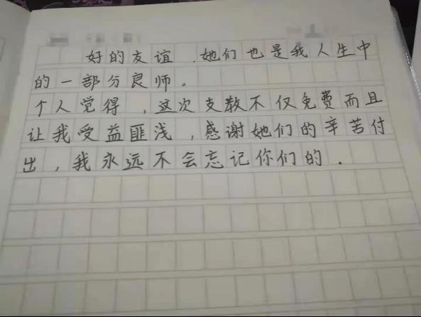 元宵节过后,学生们开学的步伐也越来越近,短暂的相处也迎来了告别。“我班谭惜允妈妈特别过来跟我说到你们,对学生指导非常细心,以后有类似公益活动,仍请推荐给我们。”一位帮忙动员招生的初中班主任发来的反馈在志愿者群里引起了热烈的讨论。但让这群年轻人感到兴奋的还不止于此,学生们的一封封手写感谢信更是让他们意想不到。