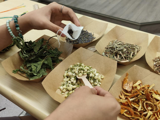 端午,五毒之恶月,生人多患病,佩戴香包用以辟邪。活动以香包制作拉开帷幕,在现场,学生负责人已准备好香包、过滤袋与药材,同学们分组围坐在一起,选择自己喜欢的款式,按照功效选取药材并放入香包,一个个造型精美的香包就制作完成了。有同学将香包挂在背包上,有的则打算送给自己的家人、老师和朋友。